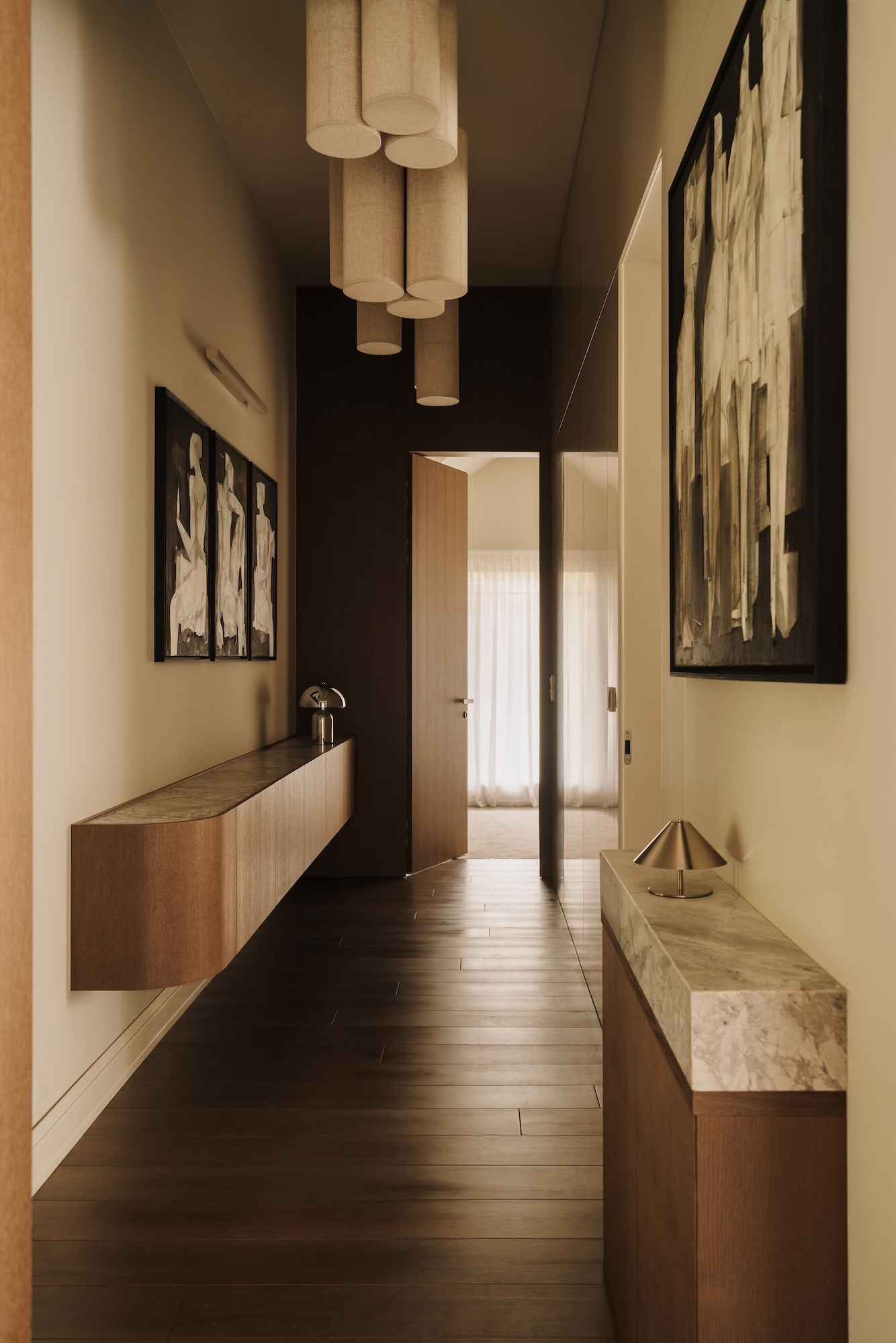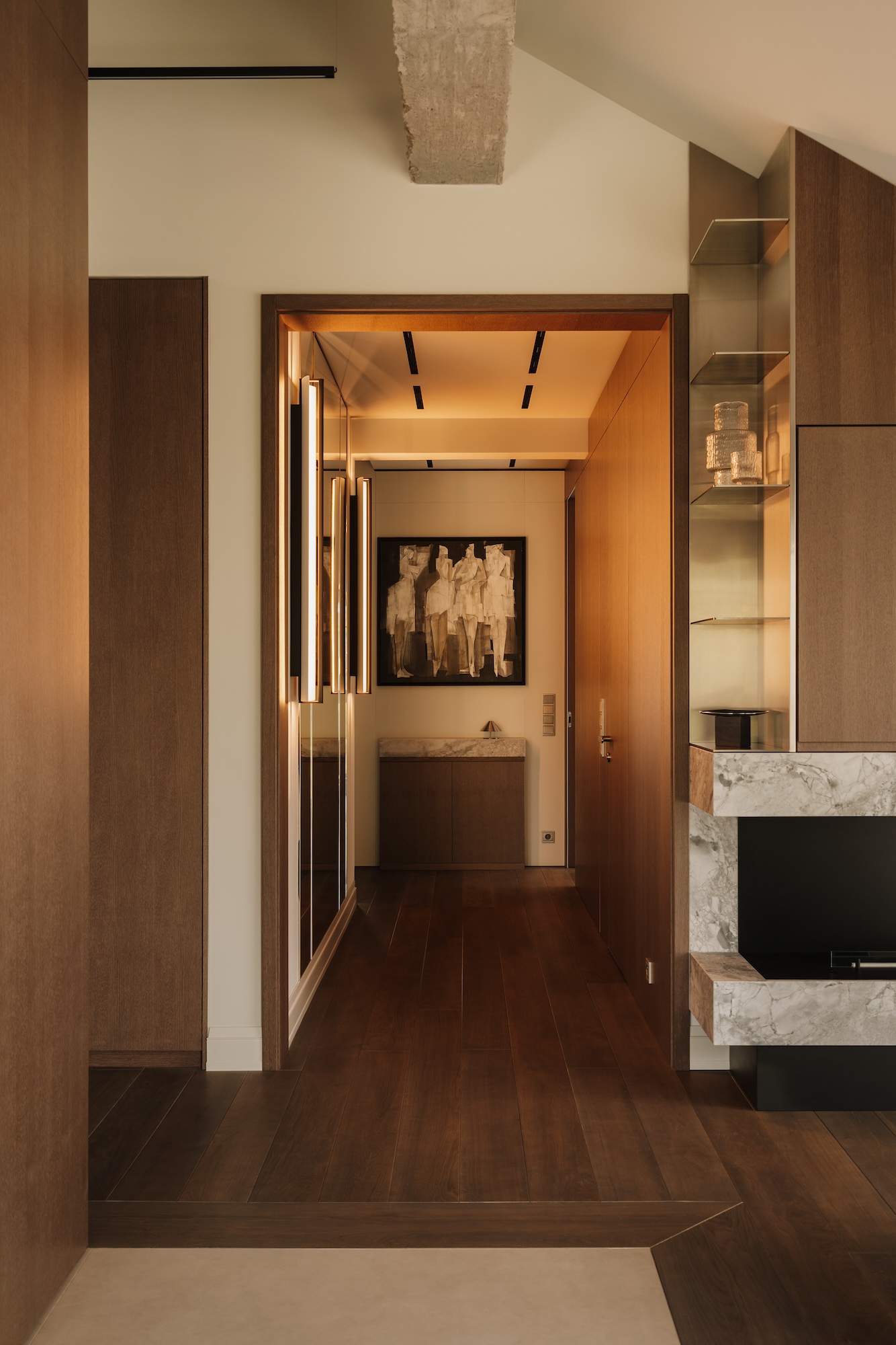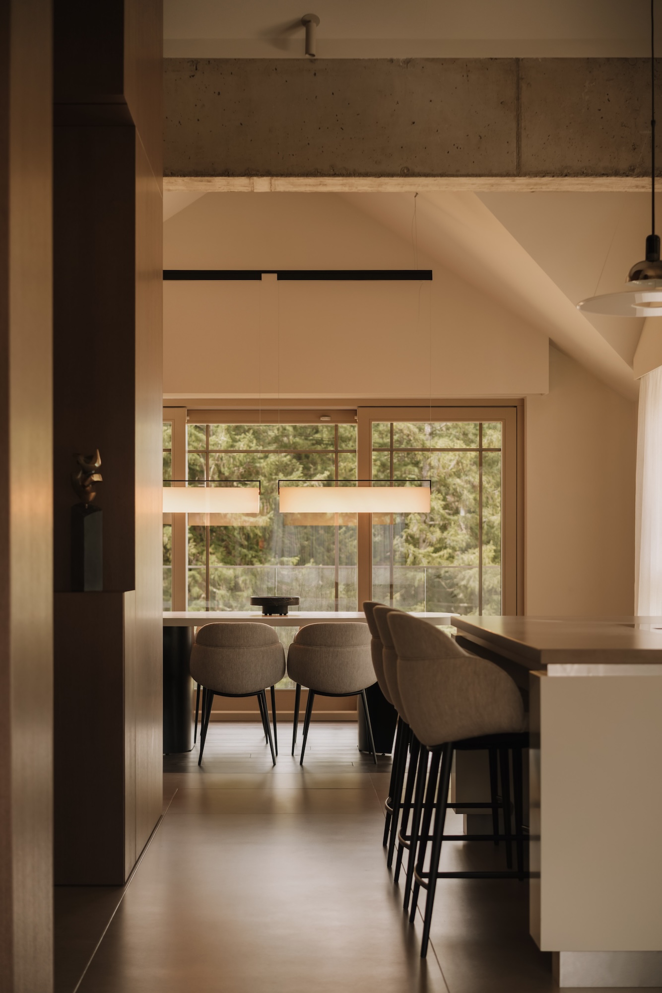 Wnętrze górskiego apartamentu zostało zaprojektowane z wyjątkową dbałością o każdy detal. Starannie dobrane oświetlenie idealnie wpisuje się w charakter aranżacji i skutecznie wypełnia wymagającą przestrzeń z wysokimi sufitami. W tym projekcie główną rolę odgrywa oświetlenie dekoracyjne, które buduje klimat i podkreśla charakter wnętrza, natomiast oświetlenie techniczne subtelnie dopełnia całość, pozostając niemal niewidoczne.